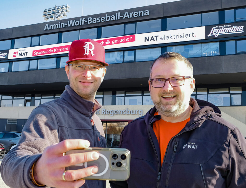 Als Unterstützer und Symphatisant der Guggenberger Legionäre freute sich der stellvertretende NAT-Niederlassungsleiter Regensburg Ronny Bullmann (l.) über die Personalwerbung auf der XXL Video-Wall am Baseball-Stadion.